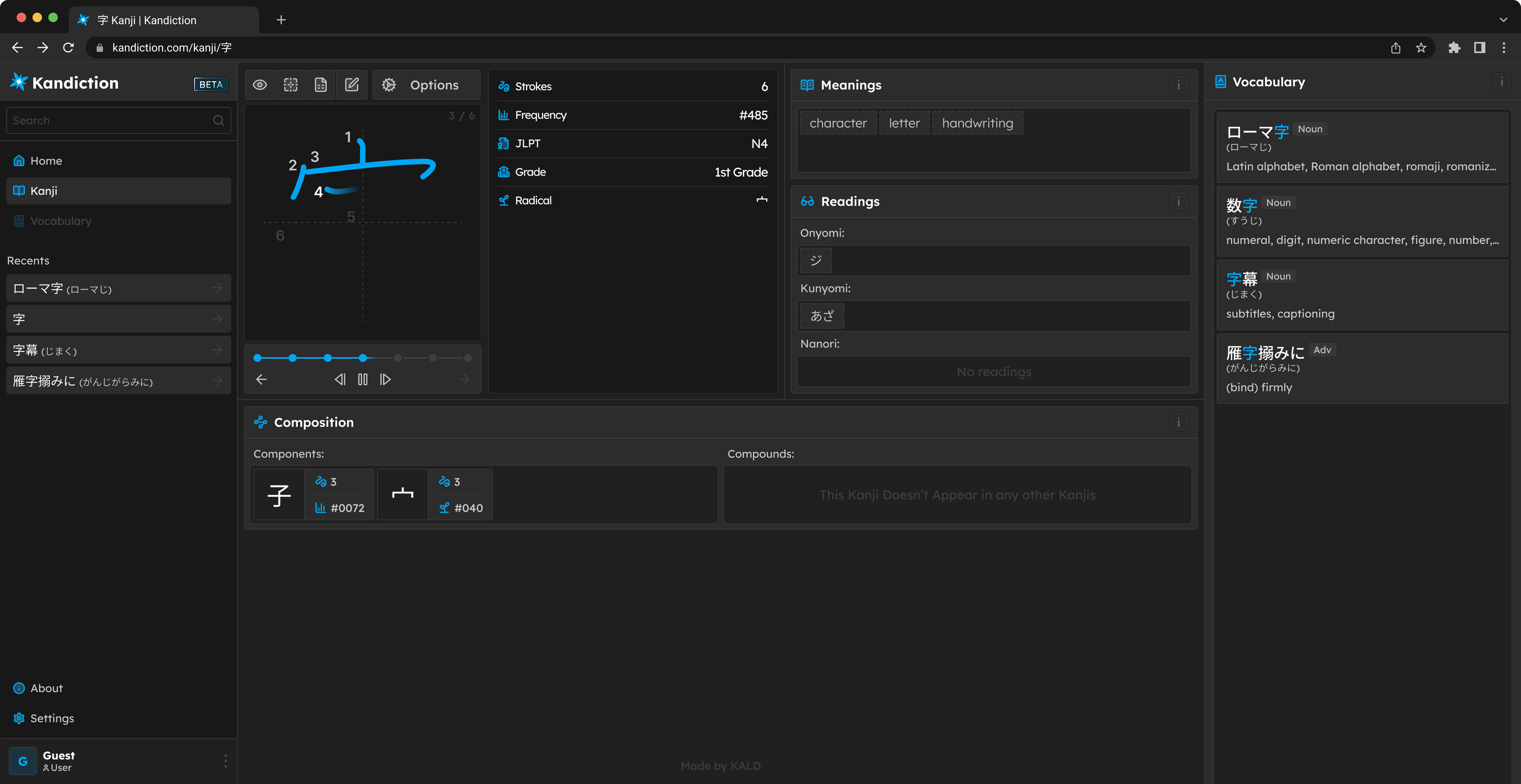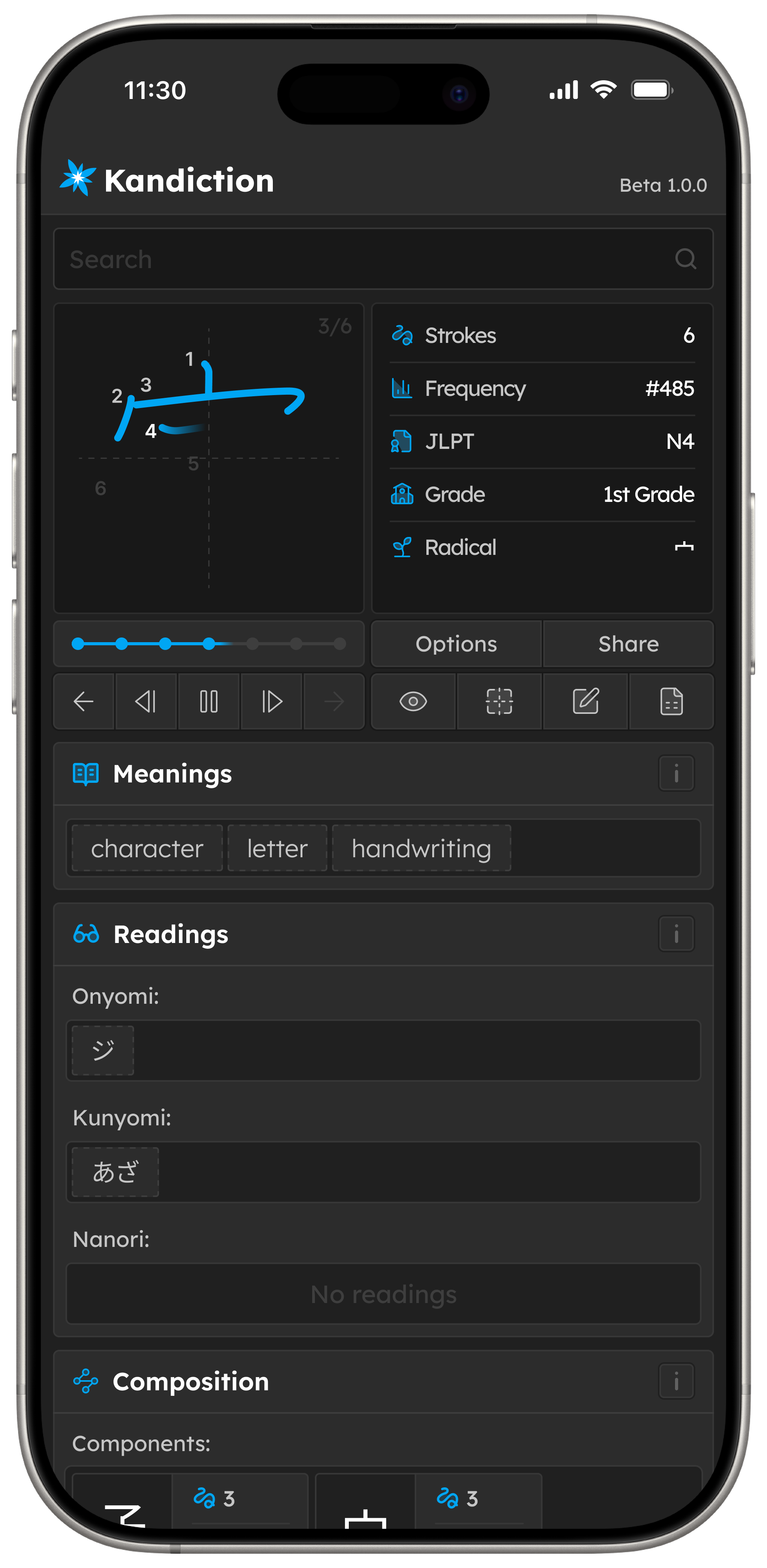 Kandiction is a fast and concise reference guide for Japanese Kanji characters. Look up stroke order, meanings, readings, and more. Future updates will introduce full Vocabulary, sentences, and expanded learning features.